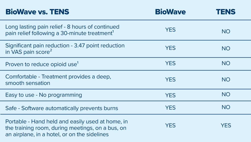 Unlike TENS and other electrical stimulation devices that only mask pain at the skin’s surface, BioWave’s patented signal technology delivers therapeutic stimulation deep into the body, directly to nerves, blocking signals at their source.