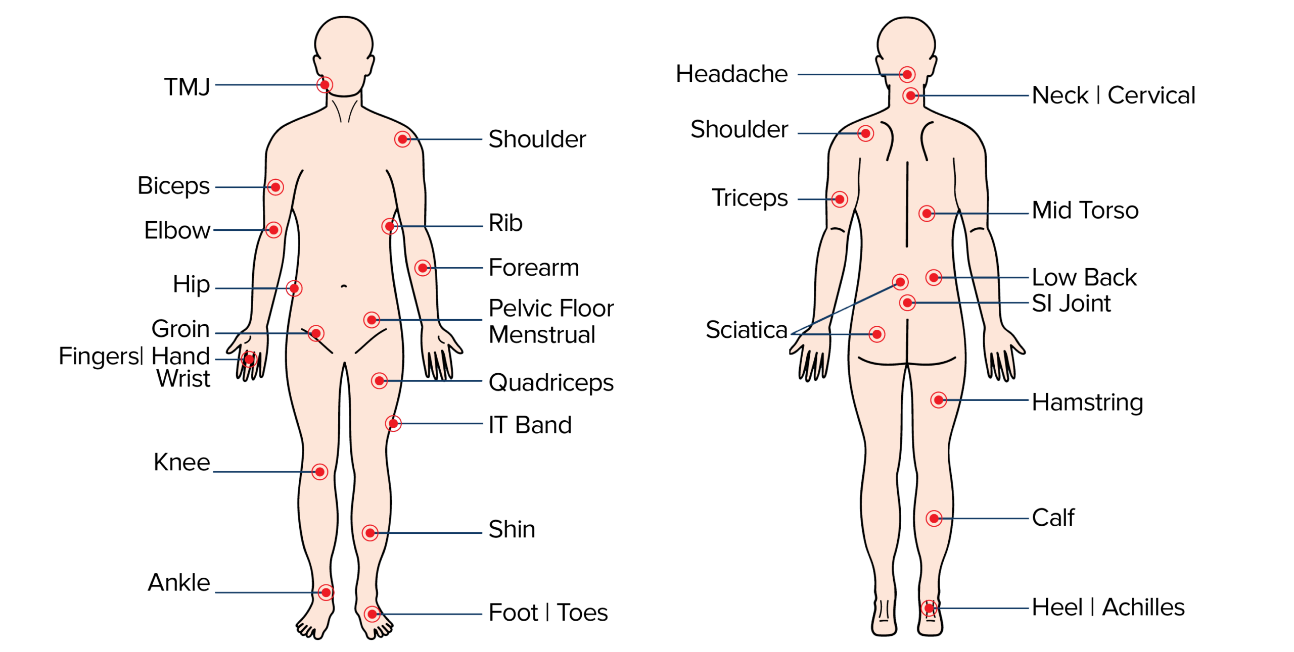 - over the origin or source of pain, and over the most painful location that is closest to the origin of pain (for example, for sciatica, one pad is placed over the spine (origin) and one pad is placed on the buttock (most painful location closest to origin); or